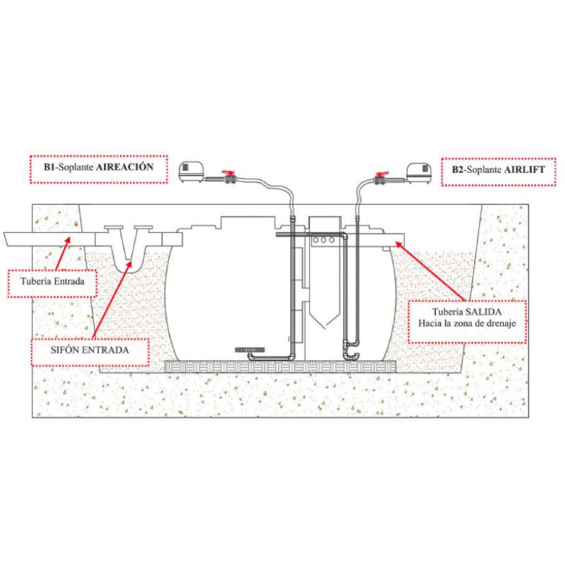Esta depuradora es la versión evolucionada de las fosas sépticas tradicionales. Incorpora un sistema biológico aeróbico de oxidación total, reduciendo los contaminantes (DBO5, MES y DQO) en más del 90%. El agua resultante puede reutilizarse para riego o limpieza mediante un tratamiento final adicional y cumpliendo las normas de la cuenca hidrográfica correspondiente.