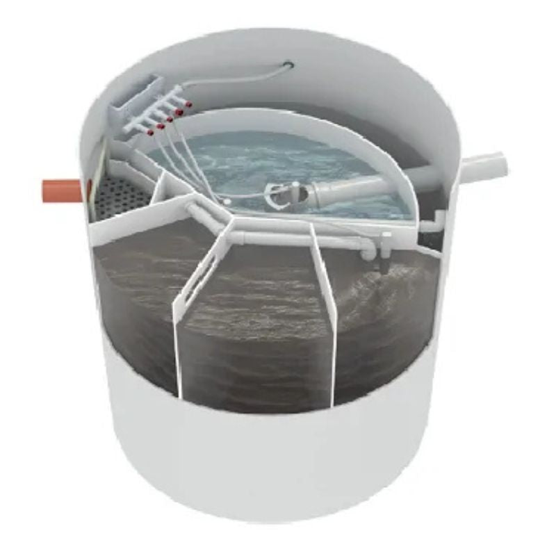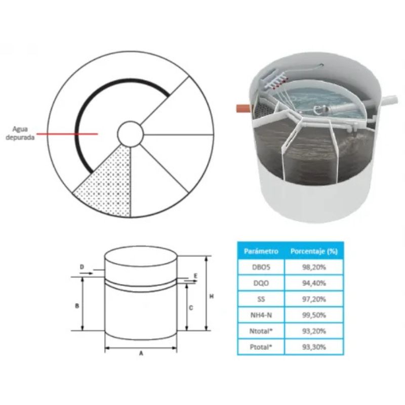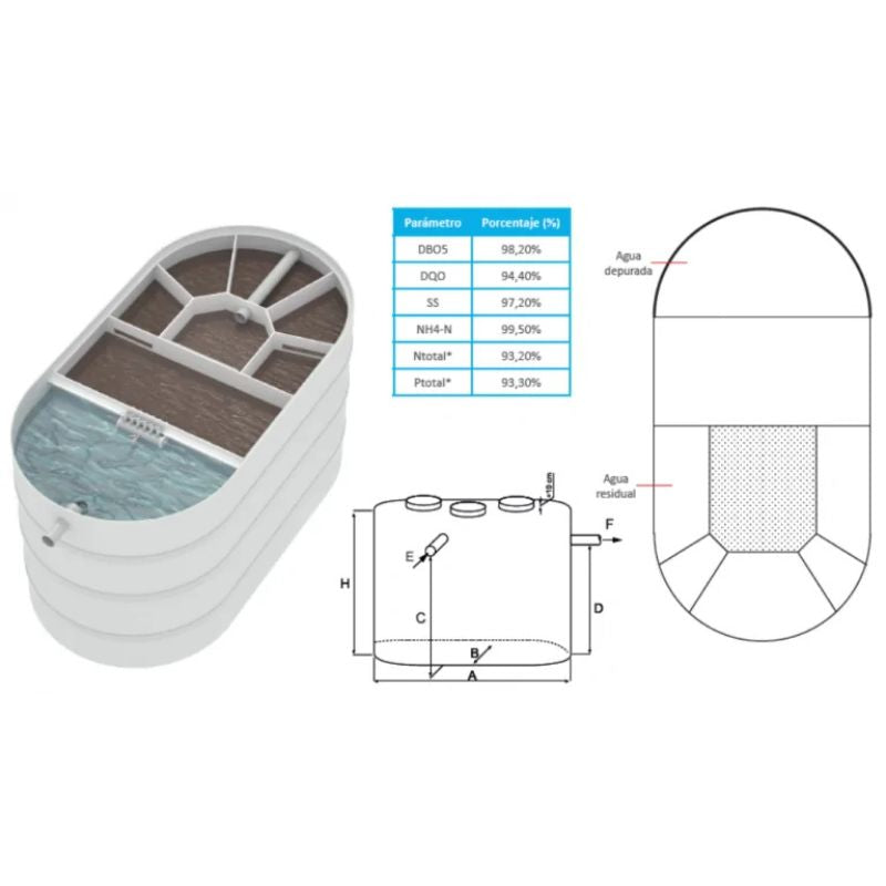 La Depuradora Biológica de Oxidación Total de Alto Rendimiento con Eliminación de Nutrientes para 8 habitantes (H.E.) está fabricada en polietileno de alta resistencia química y mecánica, con tapa superior accesible. Diseñada para zonas medioambientalmente sensibles (costa, parques naturales, ríos, lagunas), cumple con la normativa vigente y ofrece un rendimiento de depuración superior, apto para reutilización para riego sin tratamientos previos en muchos casos (según normativa de cuenca).