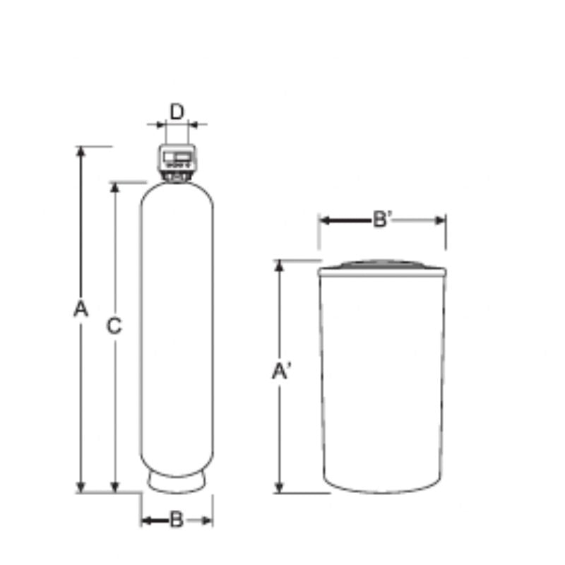 | Código | Modelo | Vol. Resina (L) | Cap. Intercambio (°Hf×m³) | Caudal máx. (m³/h) | Consumo sal (kg) | Ciclo entre regeneraciones (m³ a 30 °Hf) | Conexión | Vol. depósito sal (L) | Dimensiones (A×B×C mm) |