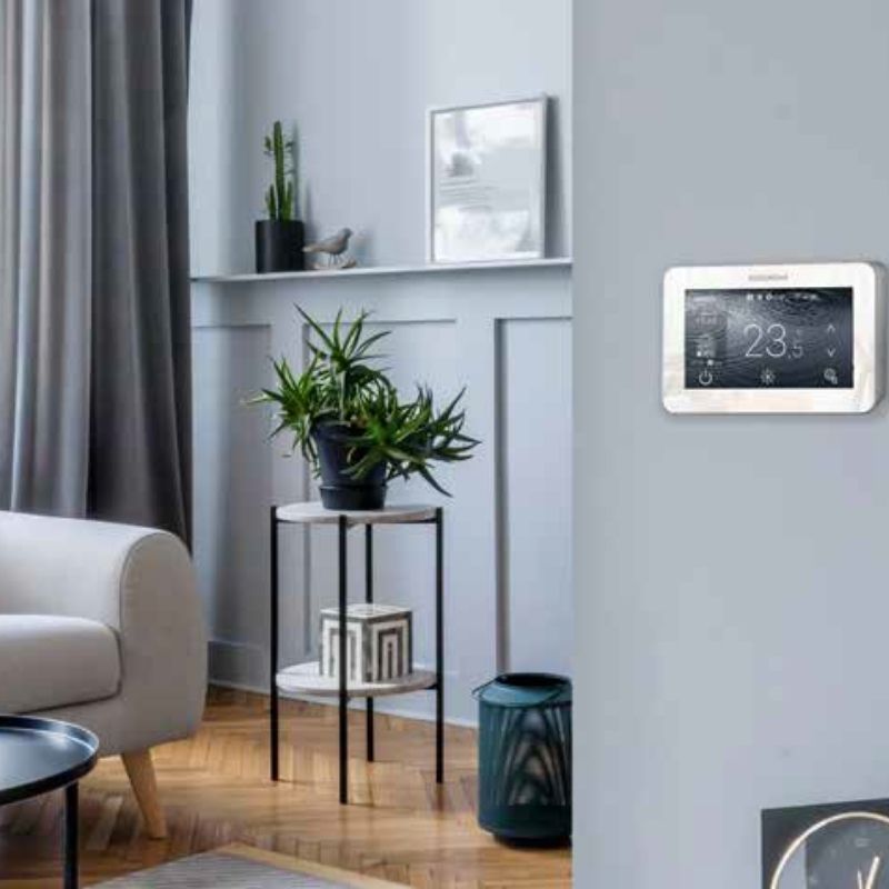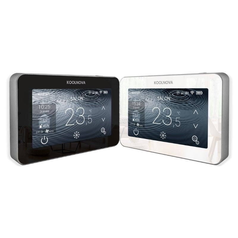 El KOOLNOVA ETERNAL CABLE es un mando cableado de altas prestaciones, diseñado para actuar como termostato MASTER o SLAVE dentro del sistema KOOLNOVA. Gracias a su interfaz gráfica a color y su pantalla táctil de gran tamaño, ofrece un control intuitivo, preciso y estable de cada zona.